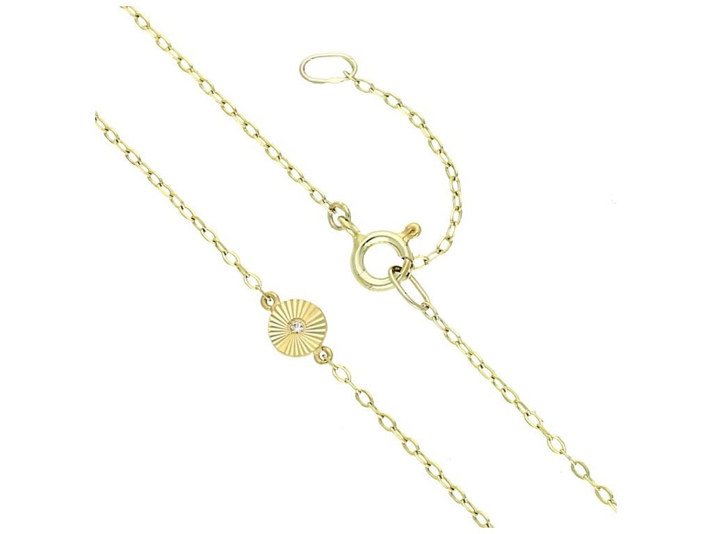 Náhrdelník je vyroben ze žlutého zlata 14 karátů s ryzostí 585/1000. Zlatý náhrdelník v hladkém lesklém provedení je tvořen řetízkem typu ankr a třemi plochými vybrušovanými kolečky, která mají průměr 5 mm. Kolečka jsou uprostřed zdobena bílými synt. zirkony. Šperk je opatřen uzávěrem typu pérový kroužek s prodlužovacím řetízkem. Jemný náhrdelník vhodný pro jakoukoliv příležitost je kvalitně vyroben v České republice.