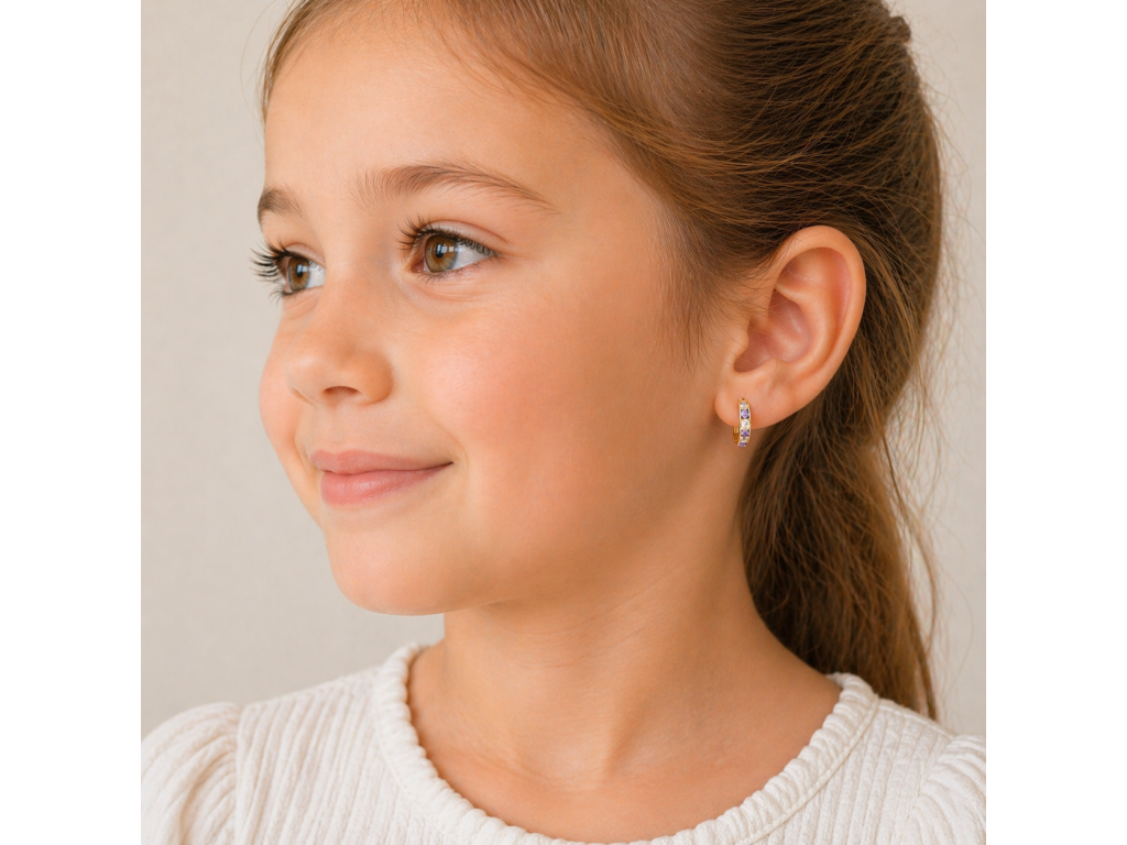 Dětské náušnice jsou vyrobeny ze žlutého zlata 14kt. 585/1000 a jsou zdobeny barevnými zirkony v bílých a fialových odstínech. Kulatý tvar zirkonů a lesklý povrch dodávají náušnicím hravý a zářivý vzhled. S rozměry 13x3 mm jsou ideální pro každodenní nošení dětí. Zacvakávací uzávěr zajišťuje pohodlné a bezpečné nošení, což činí tyto náušnice skvělou volbou pro malé dívky.