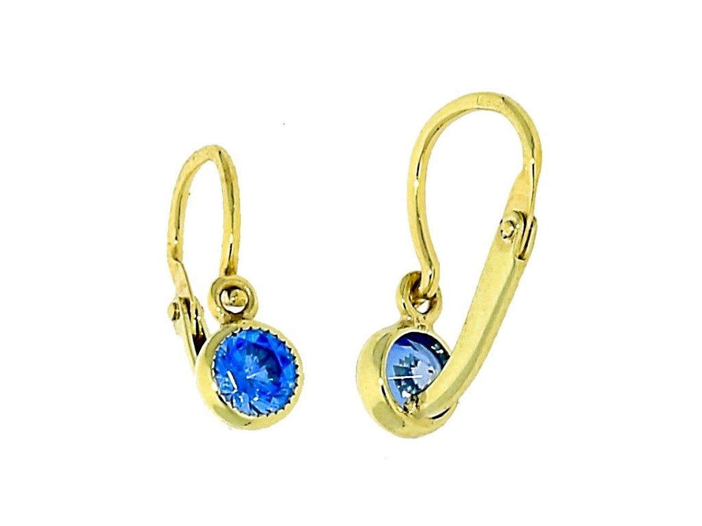 Dětské zlaté náušnice jsou vyrobeny ze žlutého zlata o ryzosti 14 karátů (585/1000). Náušničky mají hladké a lesklé provedení. Jsou opatřeny klasickým dětským uzávěrem. Tyto náušnice jsou zdobeny světle modrým synt. zirkonem s průměrem 4 mm. Celková velikost náušnice je 13 x 4,5 mm. Je vhodný i pro ty nejmenší slečny. Tyto dětské zlaté náušnice jsou precizně vyrobeny v České republice.