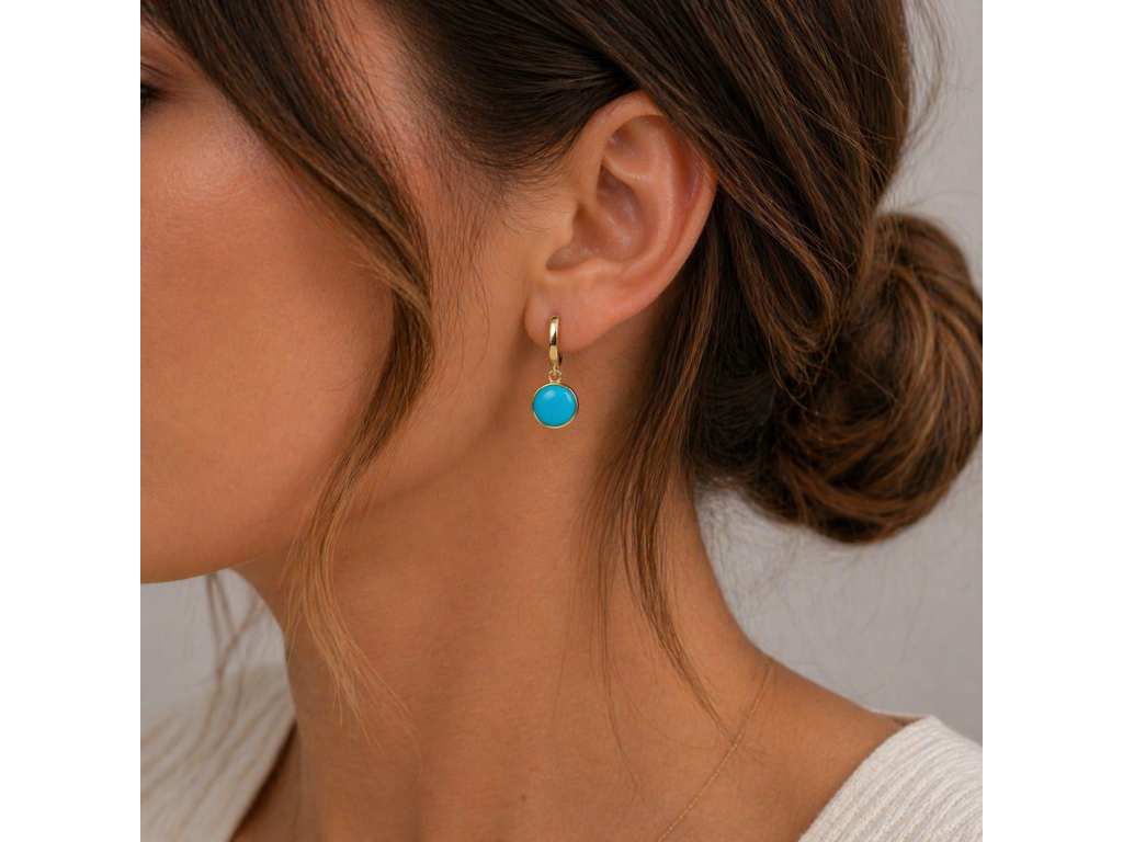 Tyto úžasné zlaté visací náušnice jsou vyrobeny ze žlutého zlata a zdobí je přírodní tyrkysy s průměrem 10 mm, které upoutají svou modrou barvou. Hladký a lesklý povrch náušnic zajišťuje elegantní vzhled, zatímco zacvakávací pojistkový uzávěr poskytuje bezpečné a pohodlné nošení. Díky svému designu jsou tyto náušnice ideální pro ženy, které chtějí dodat svému outfitu výrazný a stylový prvek vhodný pro různé příležitosti.