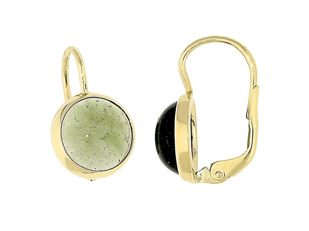 Tyto krásné náušnice jsou vyrobeny ze žlutého zlata ryzosti 14-kt. 585/1000. Zlaté náušnice v hladkém lesklém provedení jsou osazeny broušenými přírodními vltavíny zelené barvy. Průměr vltavínu, který je broušen do polokoule je 9,50 mm. Náušnice mají klasické patentové zapínání. Nádherné zlaté náušnice s přírodními kameny jsou vhodné i pro každodenní nošení. Vltavínové náušnice pochází z naší zlatnické dílny.