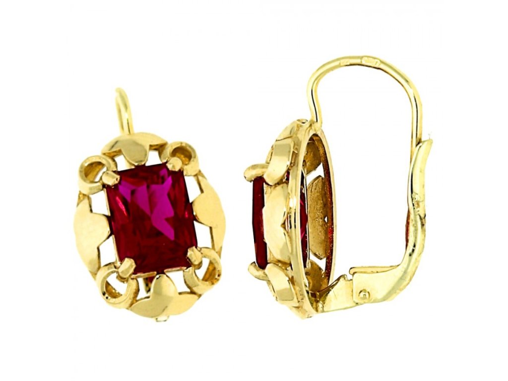 Zlaté náušnice jsou vyrobeny ze žlutého zlata o ryzosti 14 karátů (585/1000). Mají barokový design, který je typický pro elegantní a složité tvary. Náušnice jsou osazeny synt. velkým rubínem obdélníkového tvaru. Velikost kamene je 8x6 mm. Náušnice mají patentový uzávěr. Tento zlatý šperk je vyroben ručně v České republice.