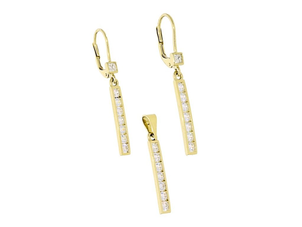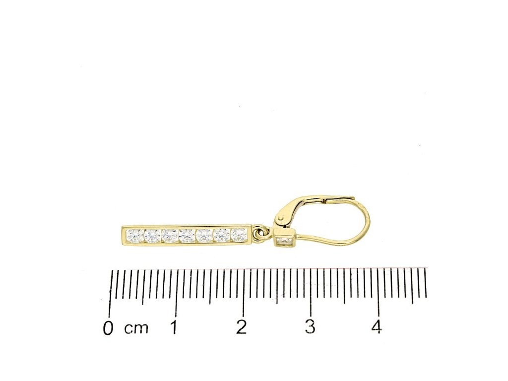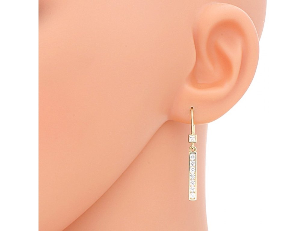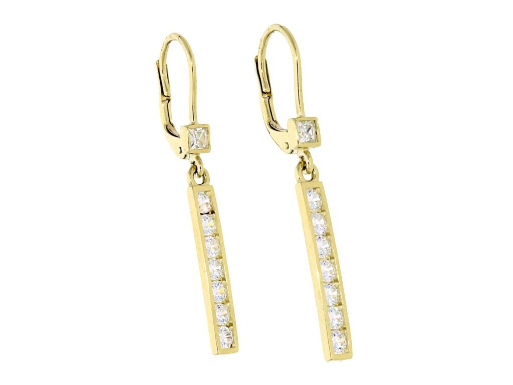 Tyto náušnice jsou vyrobeny ze žlutého zlata ryzosti 14-kt. 585/1000. Zlaté náušnice jsou v hladkém lesklém provedení a mají patentové dámské zapínání. Zlaté visací náušnice zdobí jeden čtvercový bílý zirkon a pod ním je zavěšena podlouhlá ozdoba, která je osazena sedmi bílými zirkony o průměru 2,5 mm. Krásné visací náušnice vhodné pro mnoho příležitostí jsou vyrobeny v naší zlatnické dílně. Šperk, který podtrhne ženskost a zároveň zůstává nadčasový.