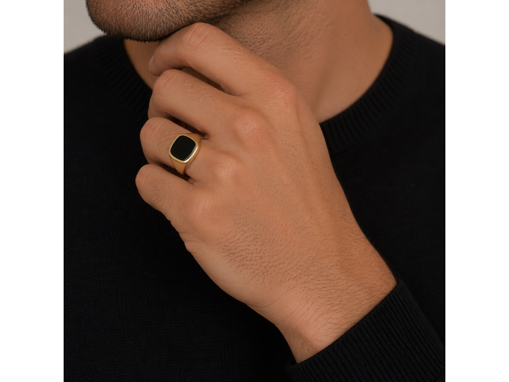 Pánský prsten je vyroben ze zlata o ryzosti 14-kt. 585/1000 a je v kombinaci žlutého a bílého zlata. Tento úžasný šperk je v lesklém hladkém provedení. Prsten je osazen výrazným černým onyxem čtvercového brusu. Velikost kamene je 15x13 mm a šířka hlavy prstenu je 18 mm. Masivní zlatý pánský prsten bude nepřehlédnutelným doplňkem pro každého muže. Doporučujeme.