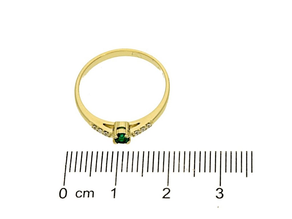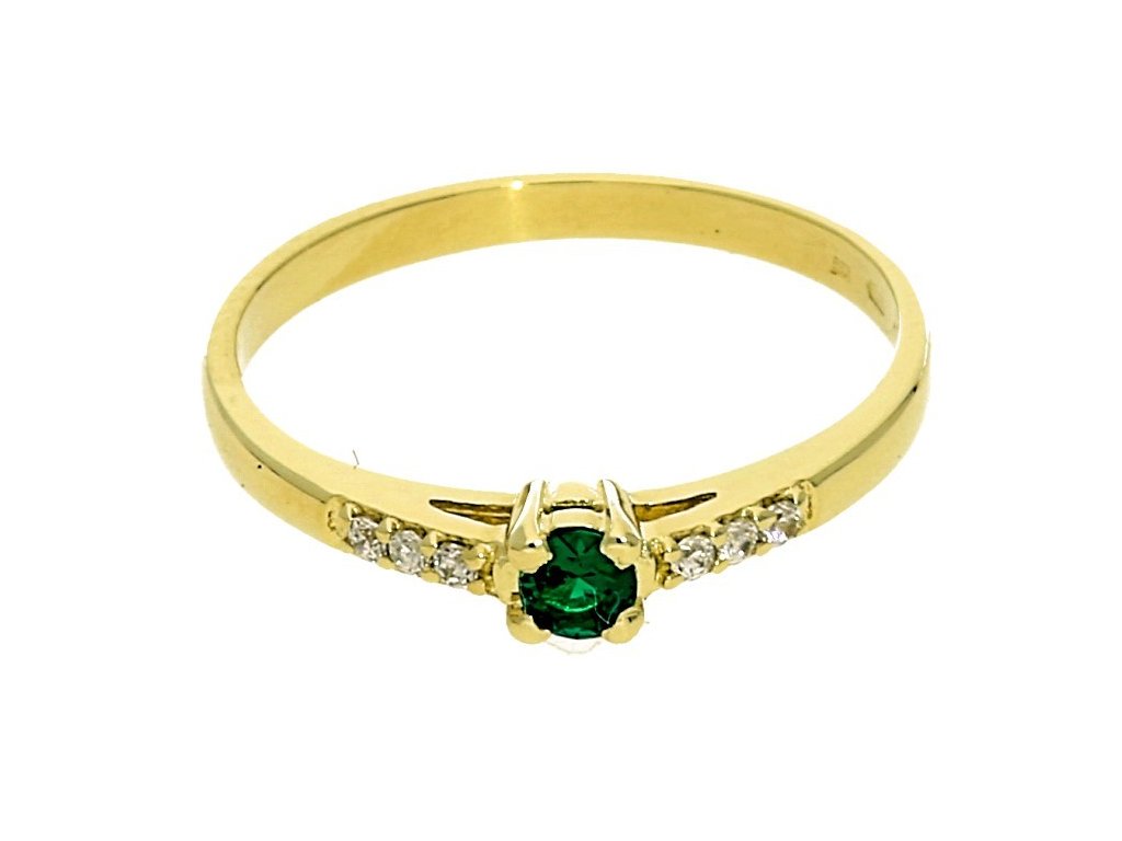 Prsten je vyroben ze žlutého zlata o ryzosti 14 karátů, 585/1000. Zlatý prsten v hladkém lesklém provedení je zdoben synt. kulatým smaragdem sytě zelené barvy, který má průměr 3 mm. Obroučka prstenu je osazena synt. jemnými zirkony bílé barvy. Tento zlatý prsten je precizně vyroben na Slovensku. Doporučujeme.