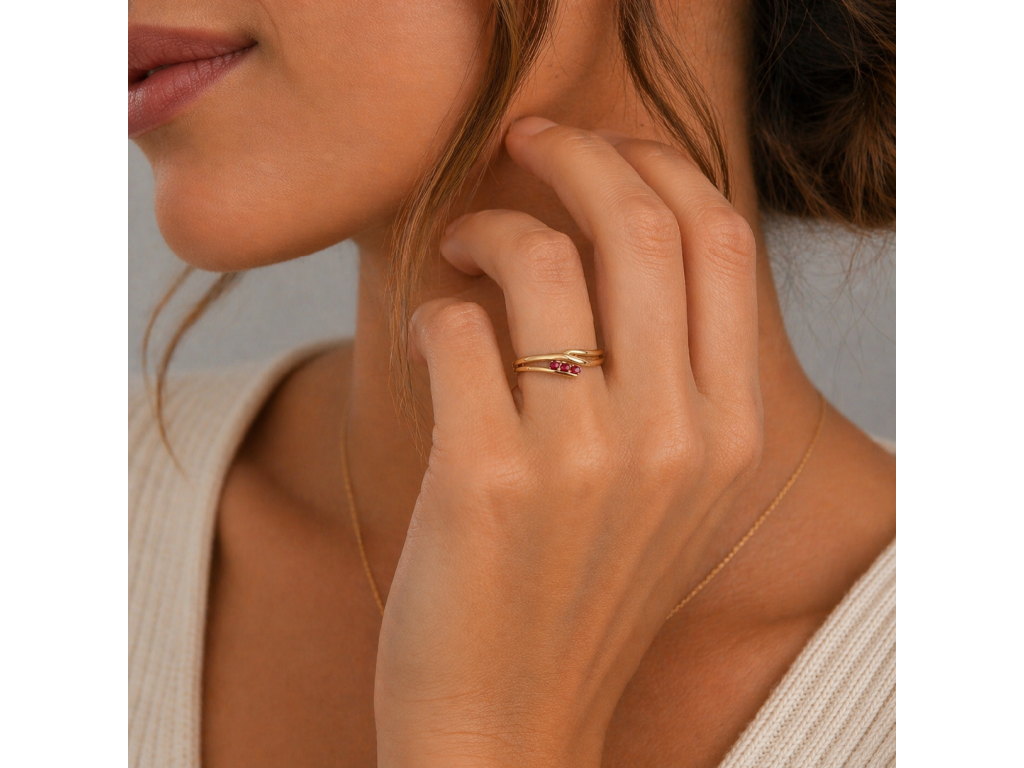 Tento elegantní zlatý prsten je ozdoben třemi červenými synt. rubíny, které mu dodávají luxusní a výrazný vzhled. Rubíny jsou často spojovány s vášní a láskou, což z tohoto prstenu činí ideální dárek pro milovanou osobu. Zlatý prsten je součástí naší vlastní výroby, což zaručuje vysokou kvalitu a pečlivé zpracování.