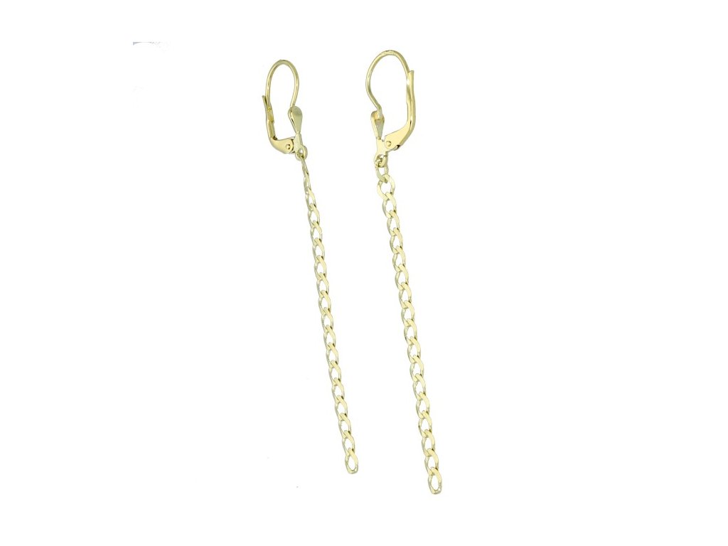 Tyto moderní visací náušnice jsou vyrobeny ze žlutého zlata a zdobí je lesklý řetízek pancr a klasické dámské zapínání. Lesklý povrch náušnic zajišťuje velmi elegantní vzhled. S celkovou délkou 71 mm jsou tyto náušnice ideální pro ženy hledající výrazný a stylový doplněk pro různé příležitosti. Náušnice krásně prodlouží siluetu obličeje a krku. Luxusní zlatý šperk.