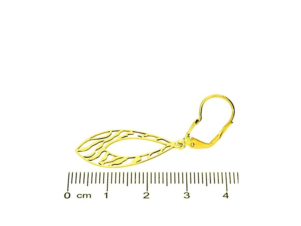 Visací náušnice jsou vyrobeny ze 14-ti karátového zlata o ryzosti 585/1000. Náušnice zdobí prořezávaná ozdoba kapkovitého tvaru. Zlaté visací náušnice v hladkém lesklém provedení jsou opatřeny klasickým dámským uzávěrem. Celková velikost náušnice je 44x16 mm. Nádherné visací náušnice jsou skvělým doplňkem pro jakoukoliv příležitost.